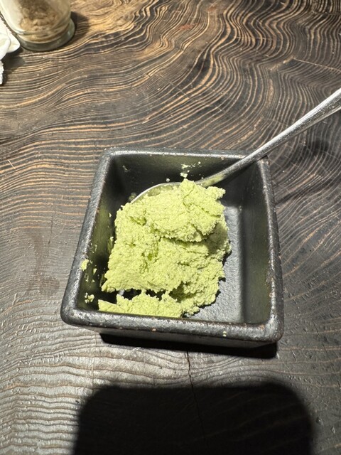 お好みで岩塩、椎茸ソルト、ワサビと何かの合わせタレ。