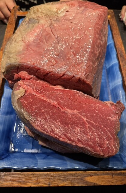ローストビーフのようなお肉は、生ジャーキー。お尻のしかも尻尾に近い部分のお肉を、酸毒が出ないようにアルカリ性にふったお肉に仕上げているそうです。柔らかくて美味しい。