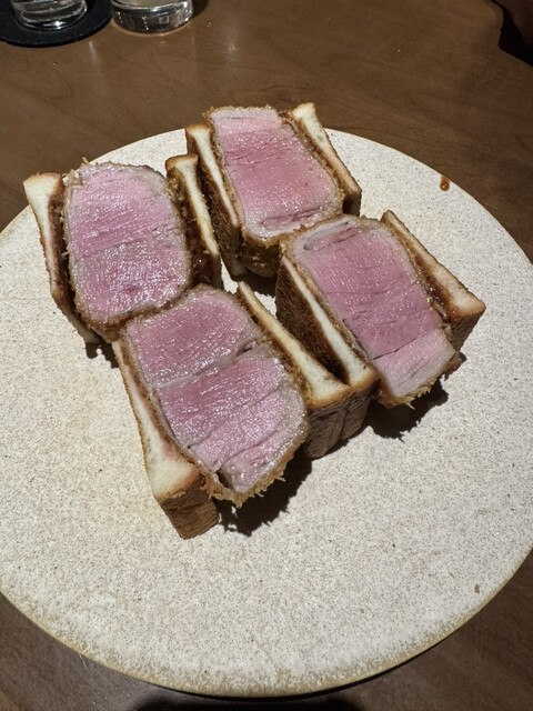 分厚いカツなのに、お箸で切れます〜。挟んでいるパンが薄めでカリッと焼かれているのが、よくあいますね❤️