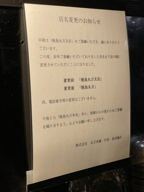 元々は丸万支店でしたが、焼鳥丸万へと変更されました。