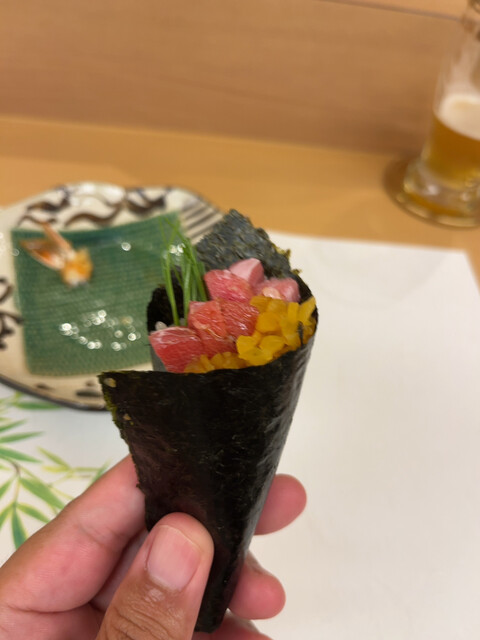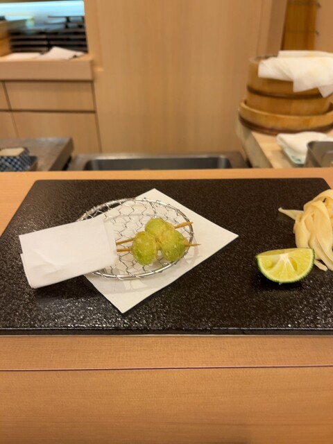 夜の街北新地のいわいさんに訪問です。北新地のお店なので敷居が高いイメージでしたが入りやすいお店で安心しました。コースでお寿司から天ぷら一品までいろいろ頂いたのですが、ノドグロとトロ、あとウニ、イクラは絶品です。ウニの産地は礼文島とのことですが、北海道で食べた味そのままでした。新たにお鮨を始めたみたいですが、旬の食材が新鮮な状態で頂けて最高でした。天ぷらは素材の味がしっかりしていて、外はサクサクで美味しかった。接待やデートにオススメのお店です。さすがミシュランだと感心しました。