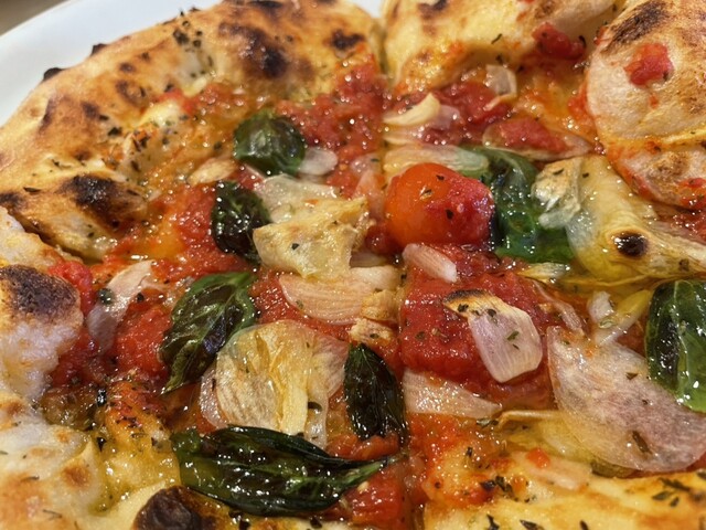 熱いうちに大きな口で頬張ると、そのピザのフレッシュさに驚きました。言葉を探してみると、ピザに鮮度が関係するんだという驚きです。絶妙に焼かれて小麦の旨さが引き出された生地。トマトとニンニクとオリーブオイルとハーブ、それが混ざり合う悶絶の美味さ!