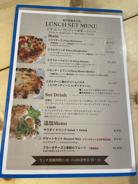 マリナーラのランチセットを注文。ドリンク、前菜4種類とピザ一枚で1500円。