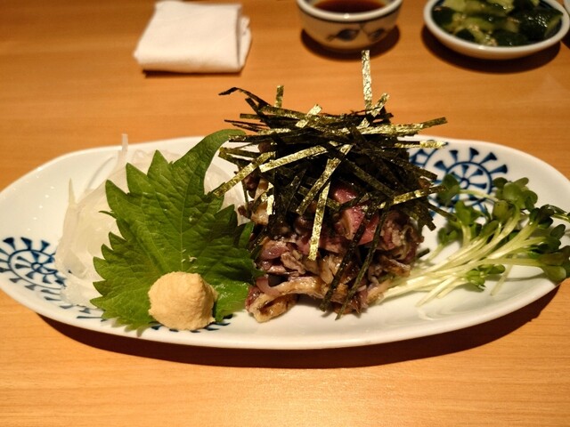 ここの地鶏のたたきを海苔とたまねぎと一緒にポン酢でいただいたら、柔らかさと適度な食感に驚くのも無理はありません。
