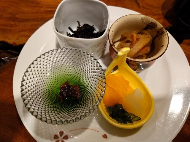 前菜(チーズとキャビア、ふぐの煮こごり、鮑のXO醤焼、クジラベーコン、鯛の竹包焼)