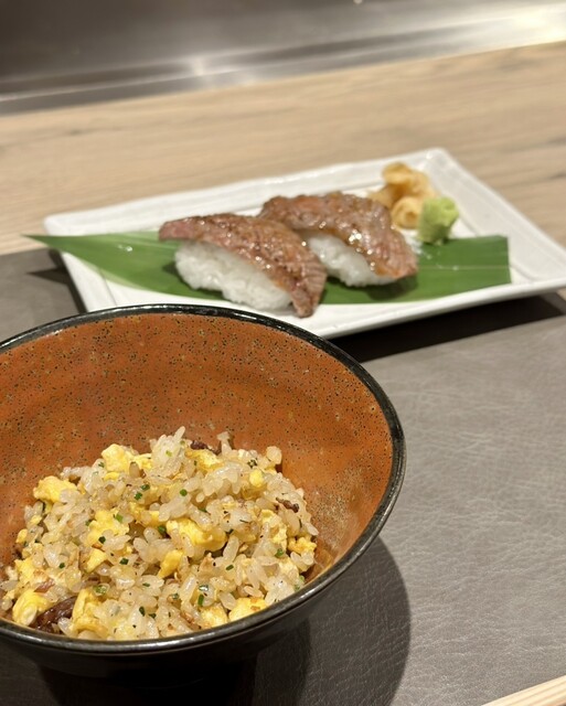 〆はガーリックライスと黒毛和牛の炙り寿司を二つずつにしてもらって、友達とシェアして食べました。