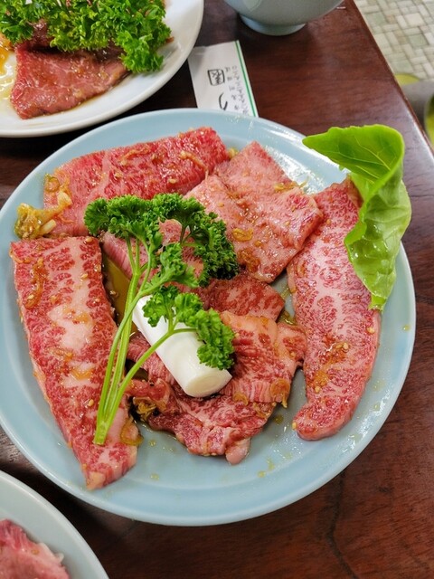 土曜日。バドミントンの練習の前に予約してやっと食べてきました。ランチメニューの焼肉定食にタン塩とカルビを追加して2人でシェアしました。店内はほぼ満席で予約している事を伝えないと断られる始末。大分ご高齢の夫婦が切り盛りしています。厨房に旦那さん。お母さんが接客です。この人数を2人でこなすのは大変そうです。ランチにはキムチとナムルがついてるのですが、ボリュームがあります。まずキムチとナムルが提供され、しばらく待つことに。忙しそうです。そんな中でもお母さんが細かい気配り。20分位は待ったでしょうか?タン塩からいただき、ロース、カルビと食べました。個人的にはロースがオススメです。お二人とも大分ご高齢なので1日でもながく営業が続きますように❗