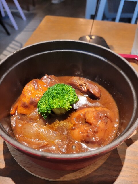 やはり女性客が多いです。なのでボリュームどうなのかと思っていたら、まずまずのボリューム。バケット4枚、人参のラペに兎も満足しそうなリーフレタス系サラダ。メインのポークシチューは一緒に煮込まれたじゃがいも等が思いの外美味しい。シチューはビーフよりポークの方がパサパサ感がなく美味しいのでは…。ただ締めに飲みたかったホット珈琲がいの一番に提供されてしまうのが残念。店のシステムが社員食堂形式なので初来店の人はしばらく放置されてしまいます。味は確かですよ。