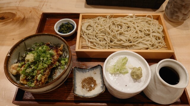 …というわけで、鶏天温玉親子そば(冷)と天むすを注文しました。