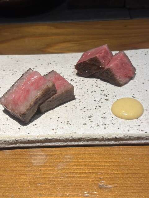 ・76℃焼き和牛ステーキ2種(茨城県日立牛 24時間前から仕込んだお肉と少し前に焼いたものの食べ比べでした!焼き加減にも拘られていて、とても甘みがありました!)