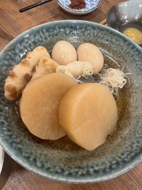 こちらの最大の特徴は「おでん食べ放題」が楽しめること。テーブルに運ばれるおでんは、関東風のしっかりとした出汁で、大根、玉子、こんにゃく、しらたき、厚揚げ、ちくわ、さらにタコ足など種類も豊富。味がよく染みていて、出汁自体も上品で飲み干したくなるほど。食べ放題だからといって手抜き感はなく、むしろ「もう一品頼みたくなる」美味しさが嬉しいところです。