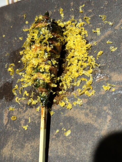 軟骨入りのひき肉にニラを巻いた串は食感も楽しく、仕上げにちょうちんをからすみにしてふりかけるという演出に感動…!味も香りも一気に格上げされます⸜(˙꒳˙)⸝✨