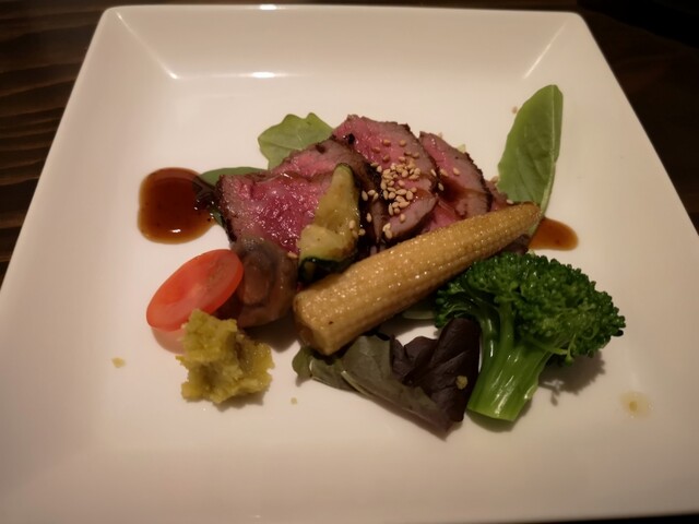 熊本の美豚のすき焼き、キノコの天婦羅、ヤマメの塩焼き(写真忘れました)これが絶妙の焼き具合! 追加でもう一尾追加したした 赤牛のステーキ デザート お腹一杯です