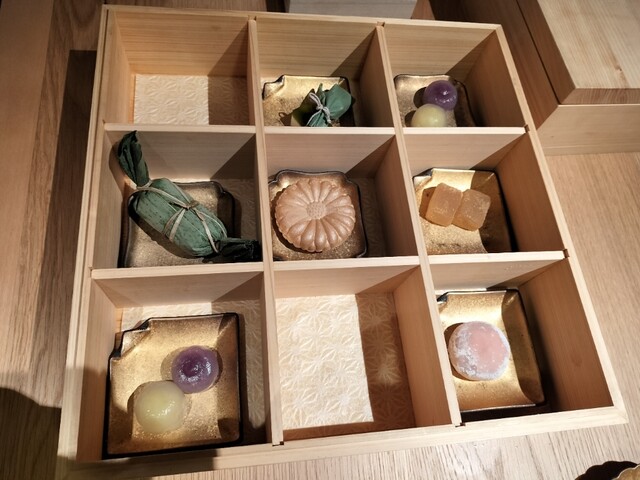 夕食は懐石料理に始まりしゃぶしゃぶそしてデザート このデザートは桐箱2段に入った和洋スイーツ 18種類全て食べれます