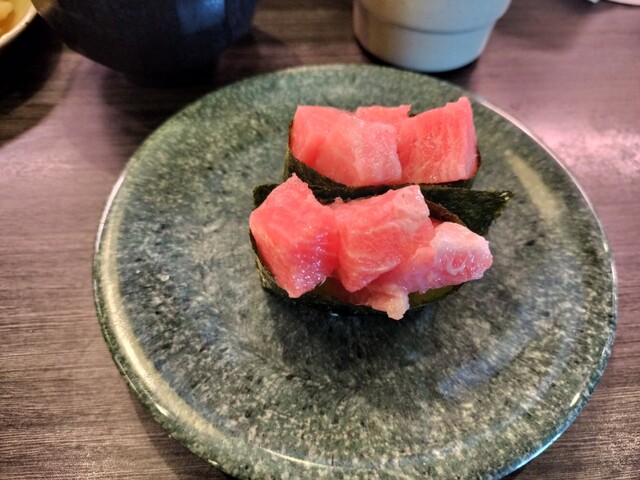 今回は軽く中トロ、鯵、中トロぶつ切り、鰻玉、あとお味噌汁を2杯