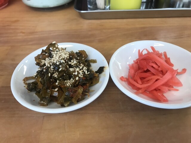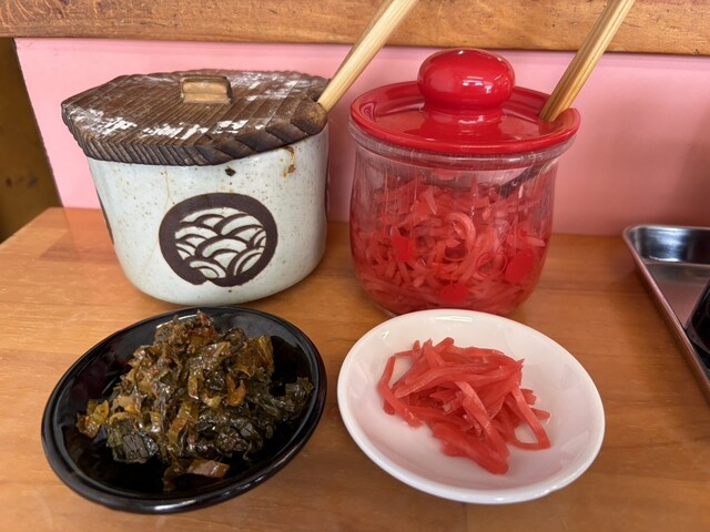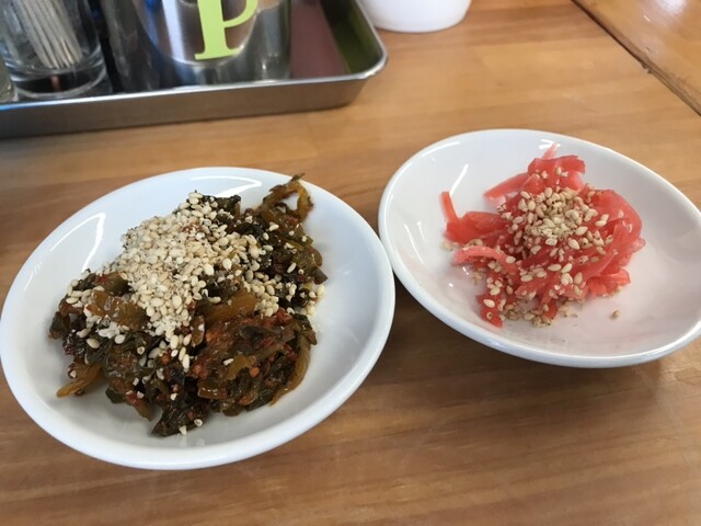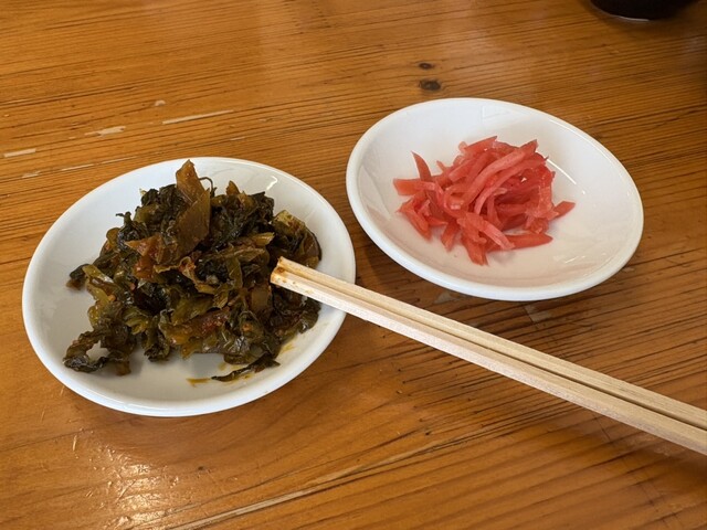 テーブルの上には、辛子高菜と紅生姜、それを小皿に取り分けて、味変しながら楽しみます。
