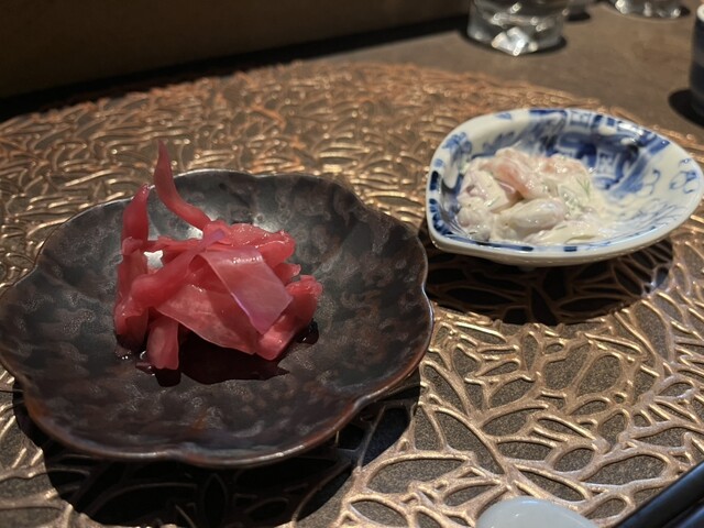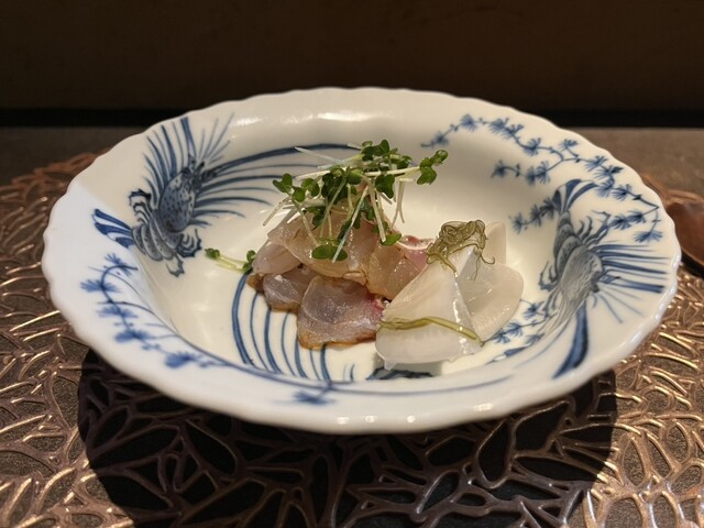 お料理の始まりは、鯛の湯引き、カルパッチョ仕立て。カブと昆布の酢漬けが添えられています。