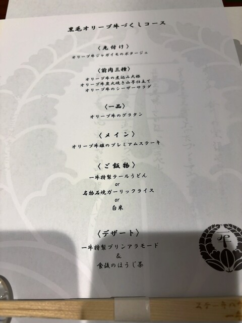 平日夜に黒毛オリーブ牛づくしコースを予約して入店。