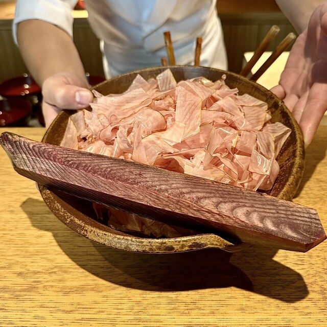 ハナダイ、じゃが芋まんじゅうを具材に使用した椀物。目の前で削ってくれる削り節と、2種類の昆布を使用したお出汁は、優しい味わいながら、深みと昆布の甘味も感じられて絶品でした!