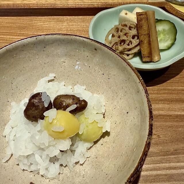 むかごと銀杏を使用した土鍋ご飯。お米本来の甘味と、ほっくりとした食材の食感を楽しめます。卵かけしらすご飯、舞茸ご飯、海鮮出汁ラーメンなど、様々な種類の締め料理を堪能できるのも魅力ですね。