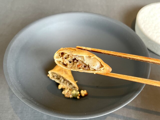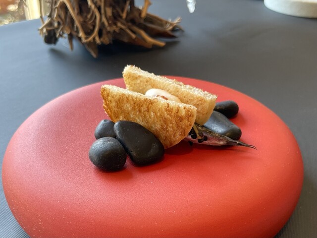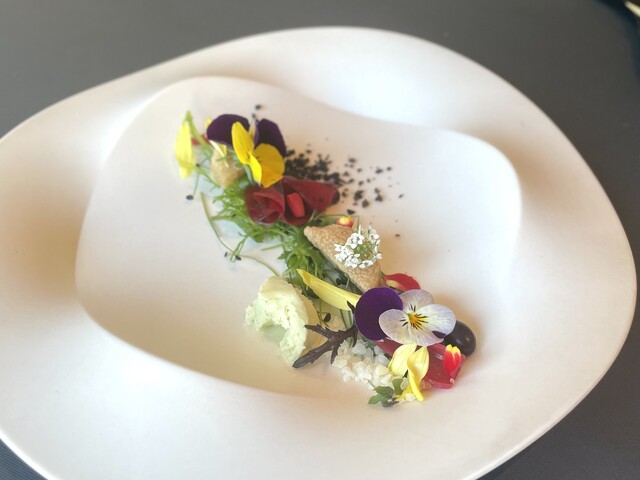 [森の地面] ヤマドリタケのフリット 鮑の肝 雪の下