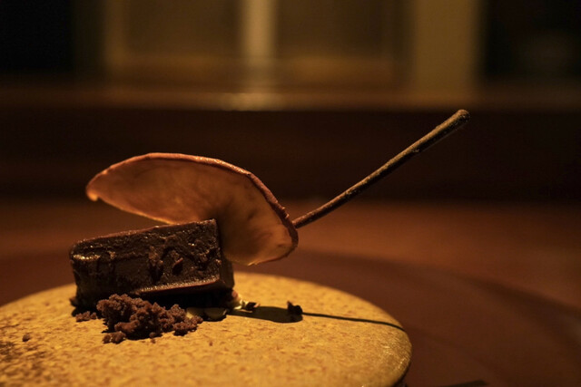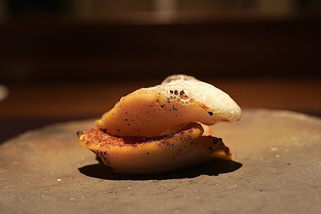 石垣貝を薪で炙ってる為、口の中で薪の味も残り炙り加減もレアめ。上には生ハムと青海苔で作ったスープを泡状にしているものが乗せてありこれまた相性が良き!