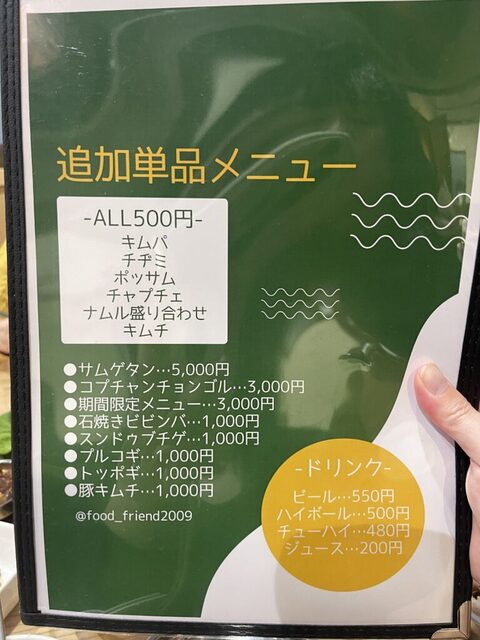 ホルモン鍋コースサムギョプサルコース参鶏湯コースプデチゲコース夜はコース料理のみで、コースにはチヂミ、ポッサム(ゆで豚)チャプチェ、ナムル、キムチなどがセットになっています。それでこの価格って驚き!!!お得すぎて…!!!