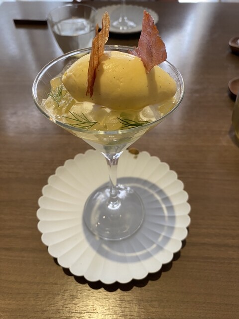 くり抜かれたメロンはとても甘く、鹿肉の燻製の塩味がバニラアイスの甘味も引き立て、美味。