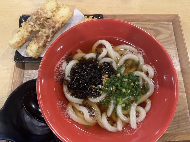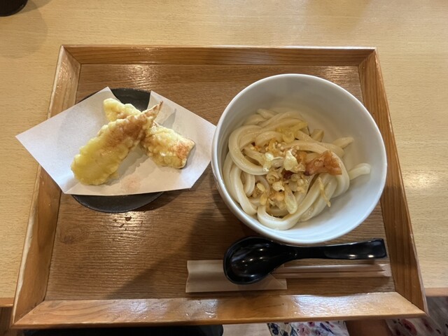 妻のちくわと鶏天のうどん 鶏天が隠れているがなかなかの大きさ これも麺大盛り無料だ