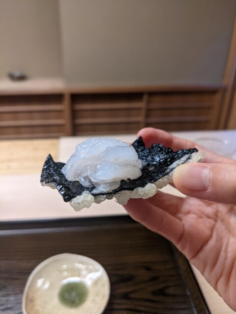 間にカマスの一夜干しの旨味を愉しみ、続いてフィニッシュとして、甘酸っぱくシャキシャキした茗荷寿司が後味をすっきりさせる薬味効果としても活躍するまた夏にも相応しい握りの一品として美味でした。