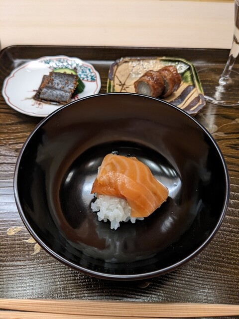甘めなシャリに甘いイカを飾り梅肉のアクセントを載せ、シャリにはスダチの酸味を加えたもの、胡麻の香ばしさを加えたものと、2種の味わいを楽しめる一口寿司でした。