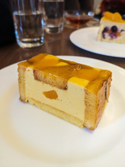 しっとりもっちりした歯切れよいブリオッシュはマンダリンナポレオンリキュールの香りとキレを醸した存在感のある味わいであり、追って口溶けよいバニラ香るマンダリンムースが繋ぎと味わいにふくよかさ、盛り上がりを醸し、アクセントのコンポートも芳醇でとろっとした食感との一体感、バランスによる口内での口溶けが素晴らしいお菓子。
