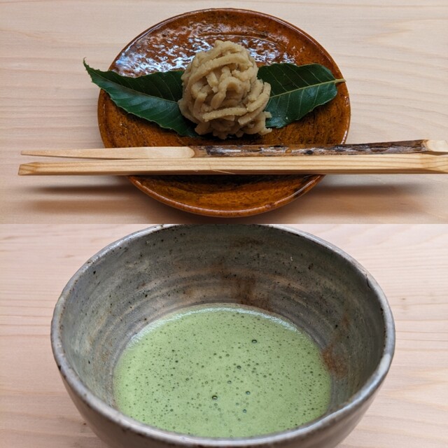 とてもきめ細かでクリーミーな口溶けの栗とこし餡のハーモニーが香りと共に堪能でき甘さ加減も実に上品な茶菓子で美味過ぎました。