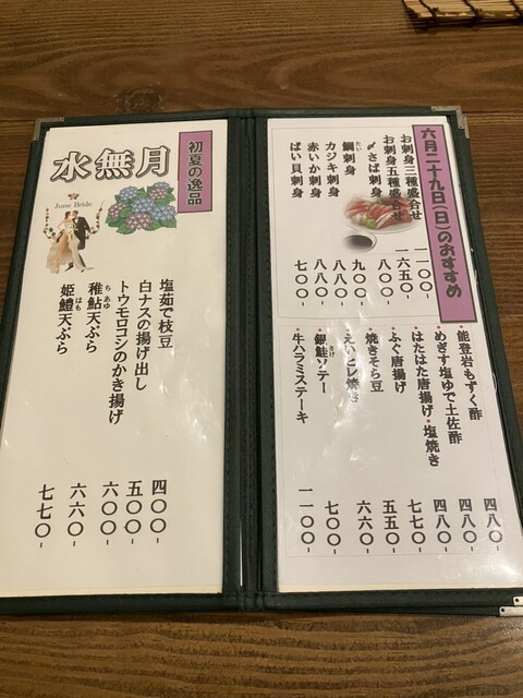 テーブル席に座り、メニューを拝見すると地の魚や地酒、旬の食材が目に入ります。