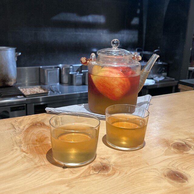 華やか過ぎずお料理の邪魔をしないよう試行錯誤された結果のラベンダー、カモミール、林檎等のブレンド(季節によって変わります。夏にはパイナップルを使われることもあるそう。)