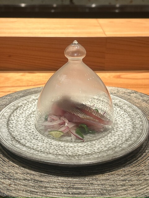 伊佐木の皮目に炭を当て直後に蓋をして香りを閉じ込めた状態で提供されるので蓋を取ると香ばしい香りが広がります