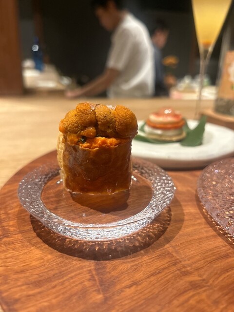 ・甘味のある赤ピーマン『ピキージョ』のパイ包みの上に北海道産生雲丹