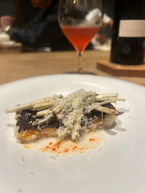 芳ばしく焼いた穴子の下に和栗のピューレ、マンチェゴチーズのソース