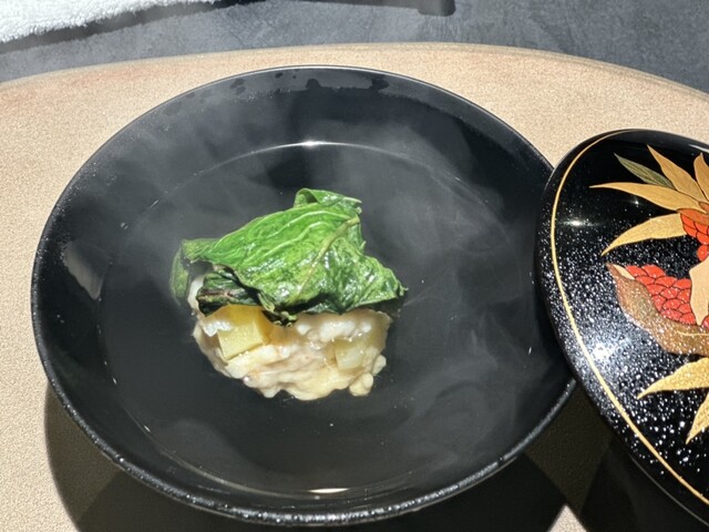 今日の一番は青海苔しんじょの椀物です。青海苔の風味と出汁がきれいにマッチして美味でした。