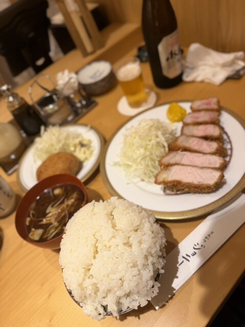 TOKYO Xロースとメンチカツ、マカロニサラダ、ご飯大盛り×2、味噌汁、瓶ビールを注文ꉂꉂ