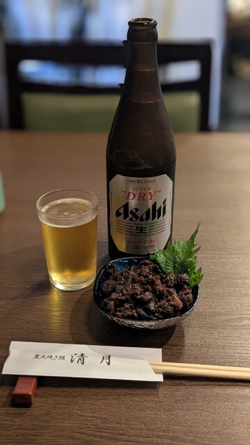 ビールをオカワリして山椒煮と肝焼きを楽しむ