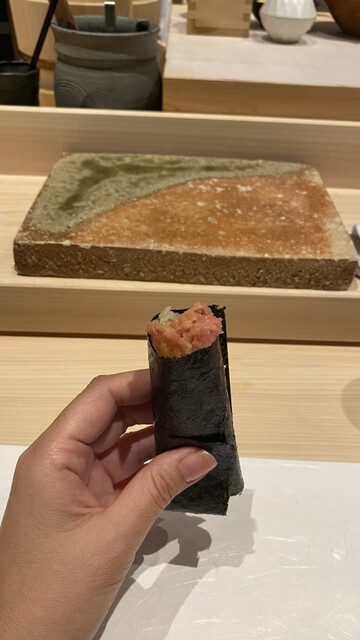 トロたくやウニの手巻きは、ほんと芸術!海苔をカットして、食べる時に下からはみ出さないように工夫して巻いてくれてました。こんなお寿司屋さんは初めてで、気遣いに感動した〜