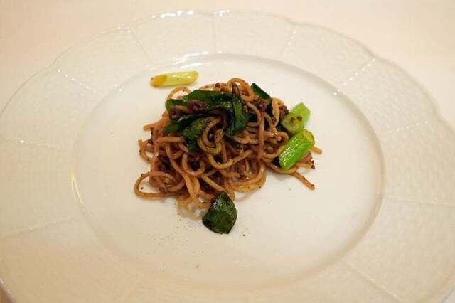 炙り三田牛カイノミ乗せホワイトアスパラのリゾット、山椒のソース