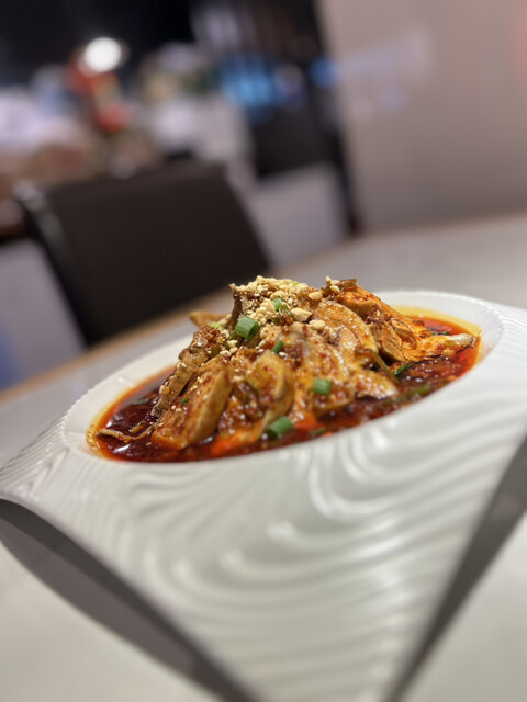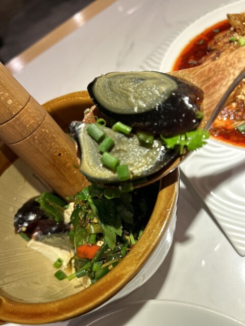 こちらの、ピータンと焼き唐辛子と豆腐和物 擂椒皮蛋豆腐の豆腐は木綿豆腐でした。ピータンのまったりした甘みのある食感と焼き豆腐にピリッと刺激のある青唐辛子がマッチしていて大変美味しかったです。お酒のおつまみにも、ご飯のおかずにもなりそうです。