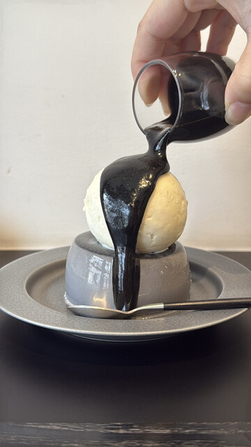 上に乗っているバニラアイスが白くて大きいのね黒胡麻プリンと黒胡麻ソースの黒とのコントラストで見た目可愛すぎる!!!
