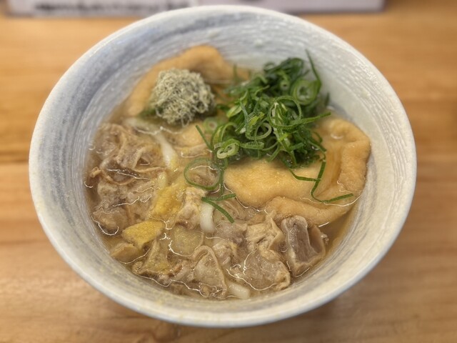 年末で閉まっているお店もちらほらある中、こちらは開いていました。5分ほど待って入店し、かすきつねうどんとちびすじめしを注文。