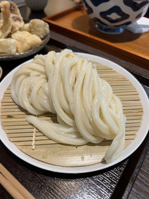 冷水でしめられたうどんは滑らかな口当たりと強いコシがあり小麦の旨みが感じられ出汁の効いたつゆにつけて食べると至福の美味しさ。