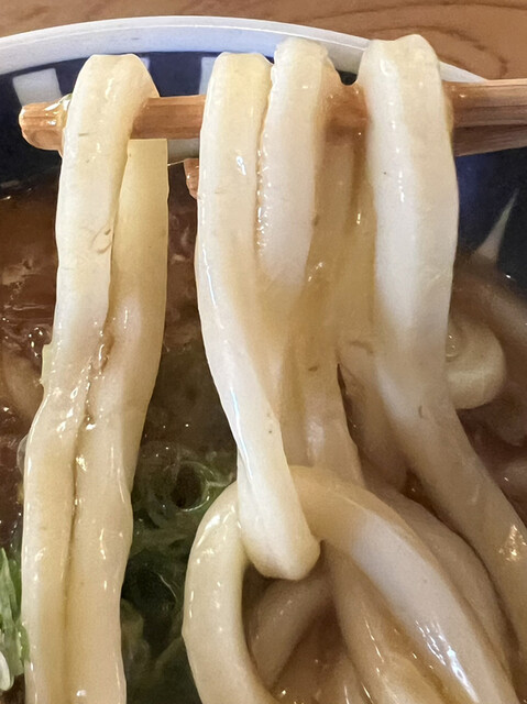 うどんは太さがあり柔らかさのあるプリッとした口当たりと粘りのあるモチっとしたコシがありとろみのあるカレーつゆがよく絡みます。