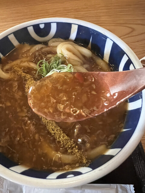 カレーうどんは刻みネギとカレー粉が盛りつけられ、つゆを飲んでみるとカレーの香りがふわっと広がりトマトの酸味と風味、タマネギの甘味に出汁と牛スジの旨みが合わさりコク深い味わい。