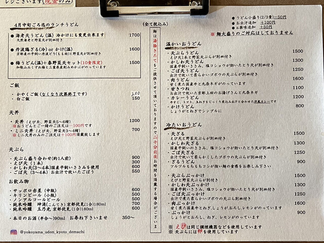 テーブルに座りメニューを拝見、4月中旬までの期間限定「京赤地鶏と季節の野菜天うどん」(1,500円)と「かやくご飯」(+200円)を注文。